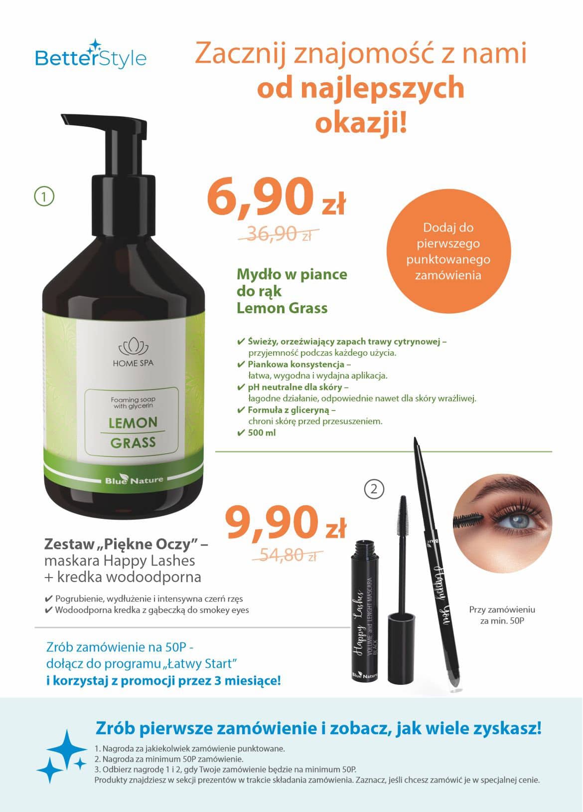 • Przy zamówieniu za minimum 50 punktów: zestaw „Piękne Oczy” (maskara Happy Lashes + kredka wodoodporna) + mydło Lemon Grass + kwalifikacja do programu „Łatwy Start” z wyjątkowymi ofertami przez 3 miesiące.